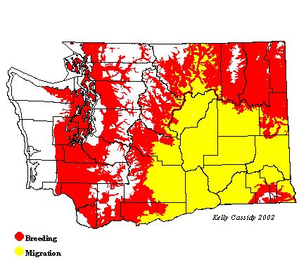 Cassin's Vireos are fairly common and widespread in eastern Washington in lower- and moderate-elevation conifer forests in the eastern Cascades, the northeastern corner, and the Blue Mountains. Although generally uncommon in western Washington, they are locally common along major river valleys and dry forests in the Puget Trough, such as the San Juan Islands, the northeastern Olympic Peninsula, Fort Lewis (Pierce County), and Ross Lake (Whatcom County).