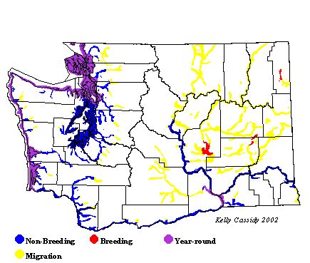 This is the only Washington cormorant likely to be seen in fresh water. Double-crested Cormorants are common year round, both on the coast and on inland waters of western Washington. They nest on islands in Grays Harbor and on rocky islets along the outer coast. Non-breeding birds can be found at lower elevations throughout western Washington. In eastern Washington, they breed at the Potholes Reservoir, Moses Lake, Winchester and Frenchman Hills Wasteways, Crab Creek (all in Grant County), at the McNary National Wildlife Refuge (Walla Walla County), at Usk (on the Pend Oreille River in Pend Oreille County), and at Cow Lake (Adams County).